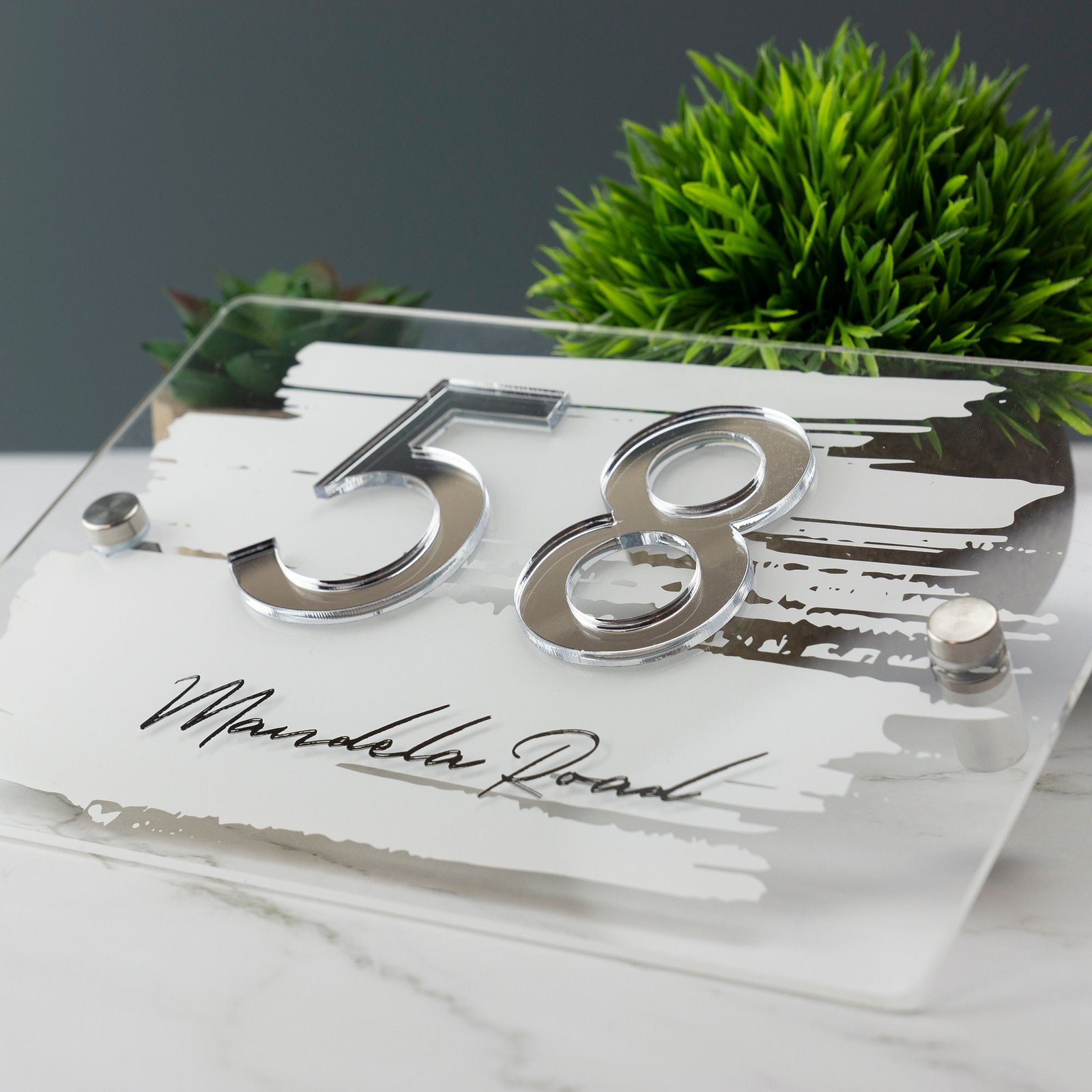 - High-Gloss Mirror Acrylic Numbers: These laser-cut mirror acrylic digits catch the light beautifully and ensure clear visibility from the street—day or night.