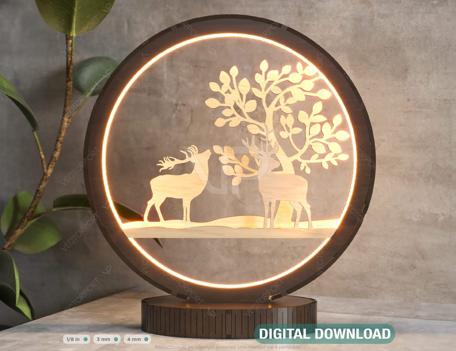 Transform your bedroom with the Snowy Scene Deer 3D LED Night Lamp, a modern and stylish addition to your bedside table. This digital download allows you to craft your own laser-cut lamp featuring a serene snowy scene with deer, bringing a touch of nature-inspired charm to your space.